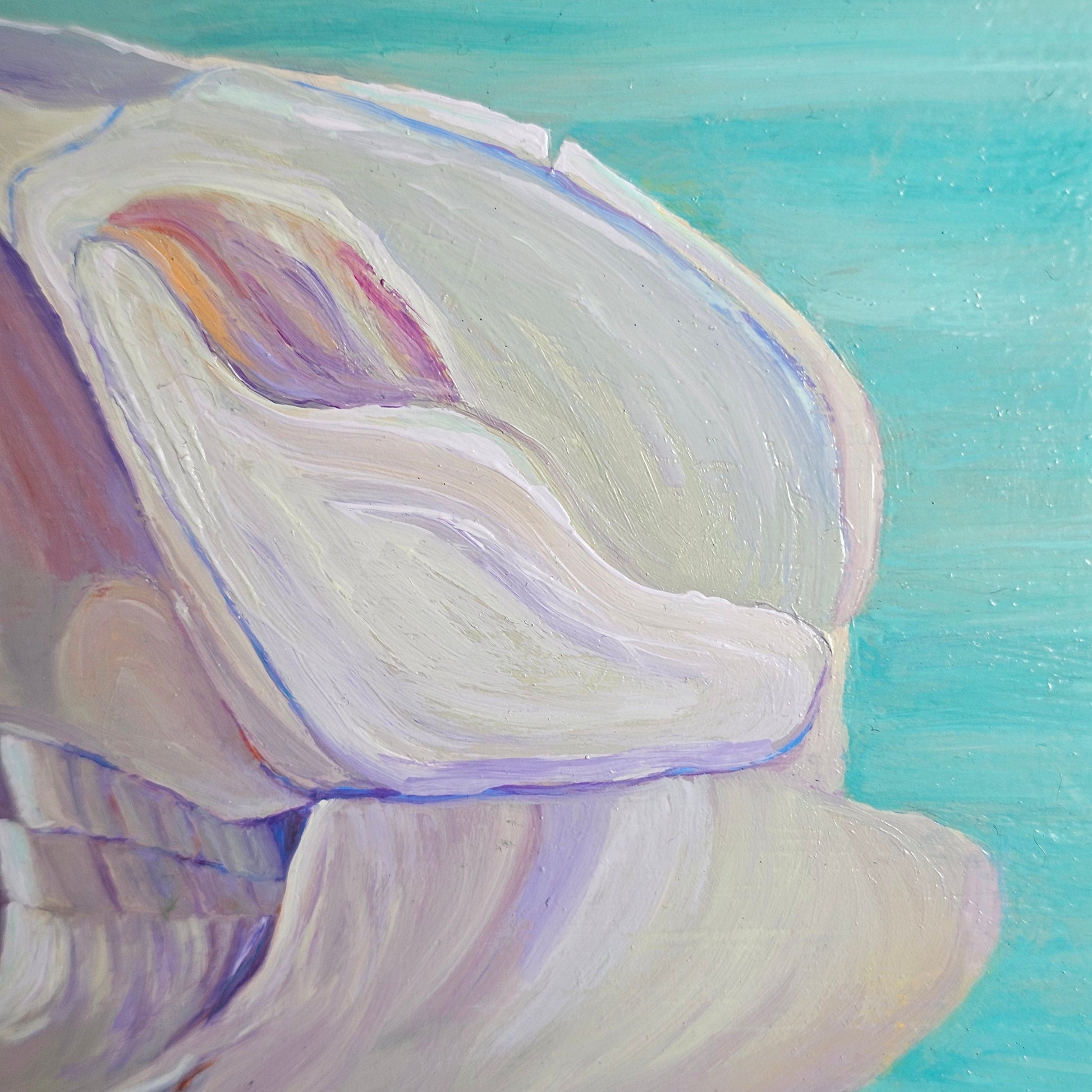 Painted in front of a sky-blue river, the skull is done in soft sunset hues, inviting reverence for quiet construction during transition.